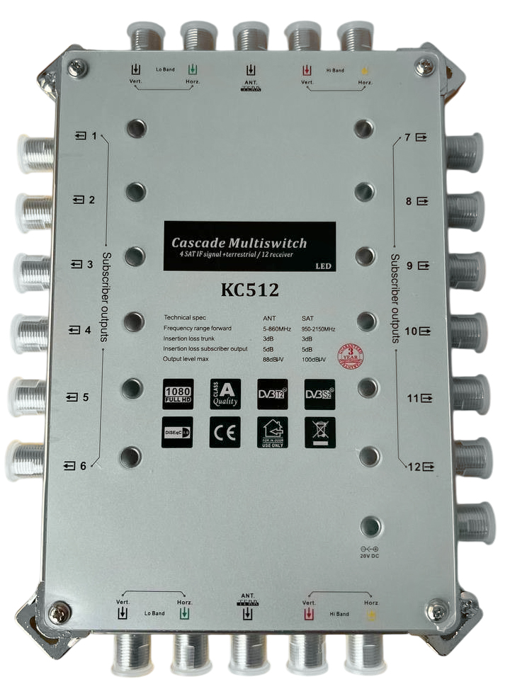 Каскадируемый мультисвитч KC512 применяется в небольших, средних и больших объемных телевизионных установках R-TV+SAT в многоквартирных домах. Количество дополнительных подключаемых розеток можно наращивать путем подключения дополнительных устройств без изменения общей схемы разводки. Высокий качественный уровень устройств обеспечивает надежную долговременную работу сети.