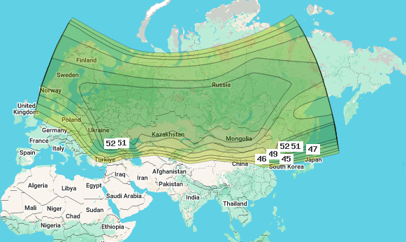 Рис.1. Зона облучения сигналов Триколор со спутника ABS 2/2A (75.0°E)